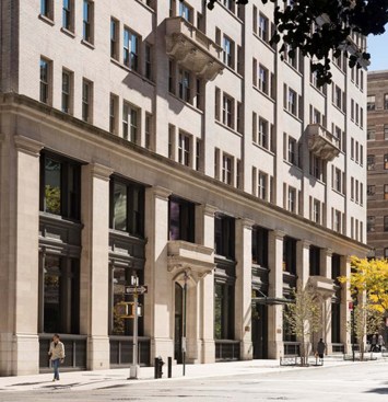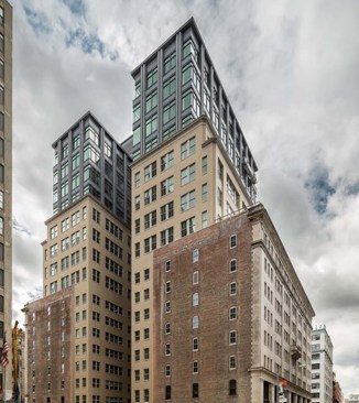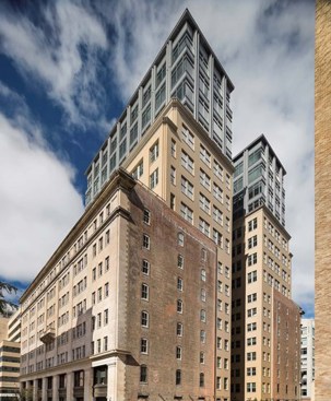 A complete restoration of the original eight-story building includes the two-story limestone colonnade, brick facade with punched openings, one-story limestone cornice and portions of the original Beaux-Arts storefronts. All decorative column capitals are restored or replicated. The heritage bronze metalwork featured on storefronts and the entry canopy recalls the neighborhood’s historic context.