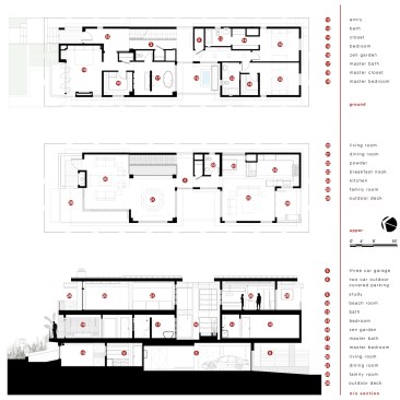 Considerate of the disproportionate 60’ x 30’ length-to-width ratio, the three-level home plan is configured much like a boat, efficiently compact with a distinct fore and aft. In its center is a double-height Zen Garden that sits metaphorically at the helm and the heart of this home.