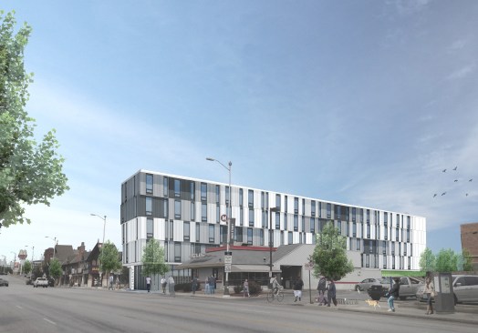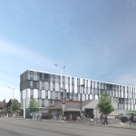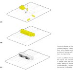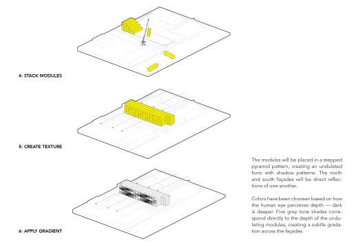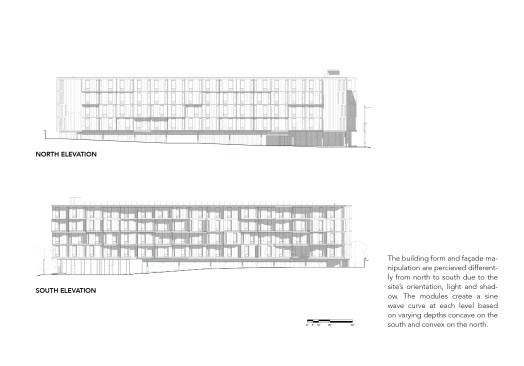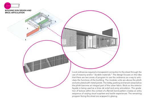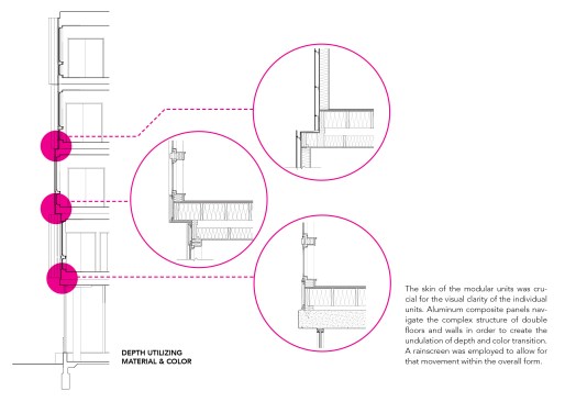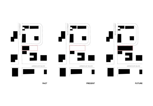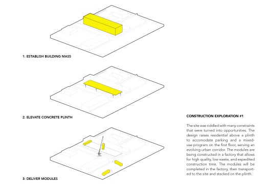 34+ Main is part of a new wave of multi-family housing construction on Main Street in urban Kansas City, the form calculated from the constraints of modular pre-fab construction. It will be the first multi-story, multi-unit residential project that utilizes comprehensive pre-manufactured unit construction in Kansas City. Four stories of pre-manufactured residential “modules” will be shipped to the site and placed one-by-one on a cast-in-place concrete plinth that houses street-facing commercial and retail opportunities. Articulating the undulating form of the building has resulted in a highly collaborative approach between architect, engineering consultants, and the pre-fab manufacturer along with their engineering specialists, pushing the industry to think about pre-fab in a highly advanced way. The site, located in Midtown, is closely connected to a vital mix of small businesses, restaurants and residences, about 20 blocks south of downtown. The project asserts itself as an active participant in a vibrant midtown community that is increasingly bridging the connective tissue of Kansas City’s urban fabric. The proposed building is positioned on the site to take advantage of premium corner street frontage and sloped topography to the east, allowing for commercial and residential entry on Main Street, with parking carved into a slope to the north. The west façade that faces Main Street offers a generous urban gesture by stepping back a bit, affording a wider sidewalk to activate the potential for outdoor public dining and gathering.
