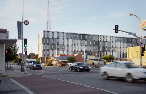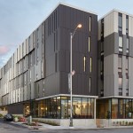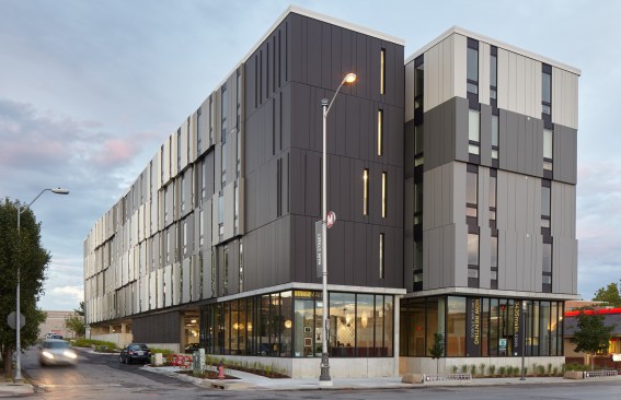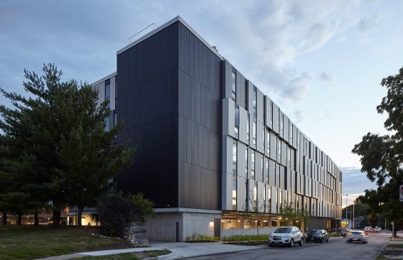The 3435 Main complex is located on the initial phase of Kansas City’s new streetcar system, and is within walking distance of 10 bus stops. Within 2.5 miles are four major universities and two teaching hospitals, so the 75,000-square-feet market rate building is targeted at young working professionals and students who aren’t dependent on cars and interested in a contemporary architectural expression. What’s more, the building increases density in a neighborhood that hasn’t seen this level of architectural attention in some time. “They really tried to do something in this neighborhood that seems like a leap of faith,” Katherine Chia said. “And they’ve done it in an interesting way—the undulation is really nice.”