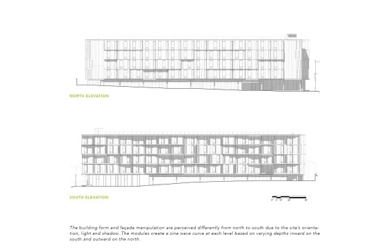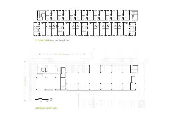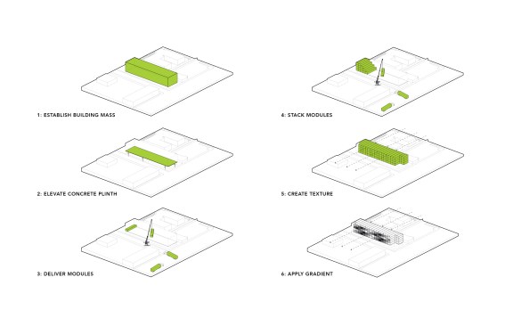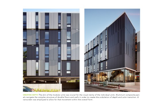 3435 Main is part of a new wave of multifamily housing construction on Main Street in urban midtown Kansas City. The site is closely connected to a vital mix of small businesses, restaurants, and residences, about 20 blocks south of downtown. The project is a transit-oriented, mixed-use development, designed for a new generation of urban dwellers that depending less on cars. There are roughly 10 bus stops within walking distance of the 80-unit development, and Main Street hosts the initial phase of Kansas City’s new streetcar system that will soon extend past the site on its way south to the Country Club Plaza, Brookside, and Waldo neighborhoods. 3435 Main is an enthusiastic endorsement of innovation in Kansas City’s increasingly homogenous market rate housing offerings. It utilizes a complex and rigid set of rules; every component is choreographed to create a composition that responds to site constraints, solar path and construction methods. The modules were placed in a stepped pyramid pattern, creating an undulated form with shadow patterns. Colors have been chosen based on how the human eye perceives depth —dark tones create the perception of greater depth relief. Five gray tone shades correspond directly to the depth of the undulating modules, creating a subtle gradation across the façades.