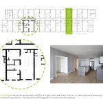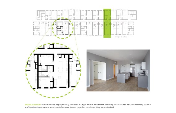 The transit-oriented, mixed-use 3435 Main project was designed by local firm El Dorado in Midtown Kansas City, Mo., a neighborhood with a vital mix of small businesses, restaurants, and residences south of downtown. Eighty units are configured along a double-loaded corridor on four floors above a ground floor plinth that contains covered parking, a lobby, and retail space. The modular apartments were sized based on a studio configuration, with additional units added to create one- and two-bedroom units.