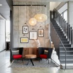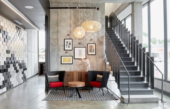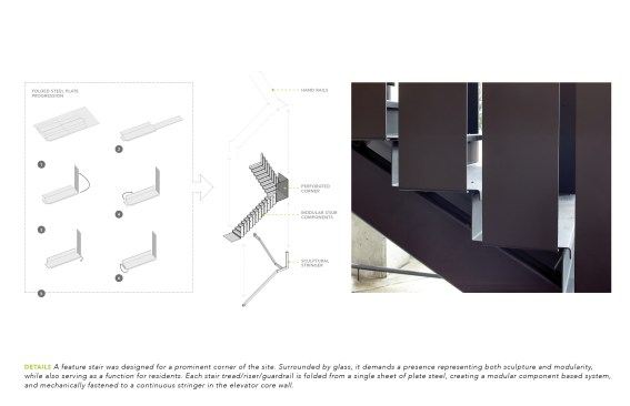 The building’s aesthetic is established by the expression of its modular construction. A subtle modulation of the stacked units causes each individual piece to shift in and out on the north and south façades. Clad in aluminum composite panels in five different shades of gray, the designers vary the tone across the façade to maximize the illusion of depth and movement. Modular construction also helped deliver the building at a low price point. “It does a tremendous job with an incredibly limited budget,” David Baker said. The lobby opens through glass walls to the corner of Main Street and East 34th Terrace. It features an exposed sculptural stair that cantilevers from the concrete elevator core, with each tread/riser/guardrail folded from a single sheet of plate steel.