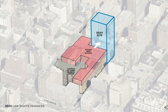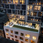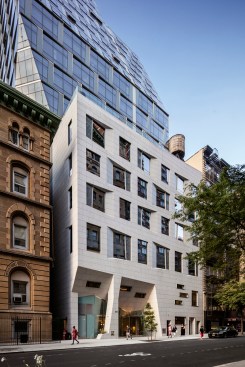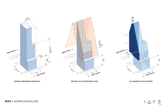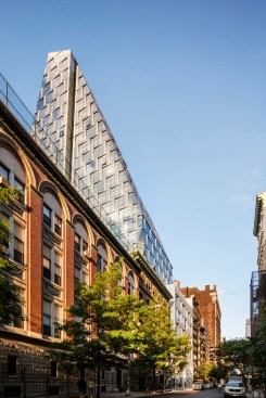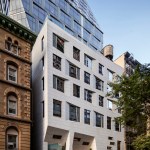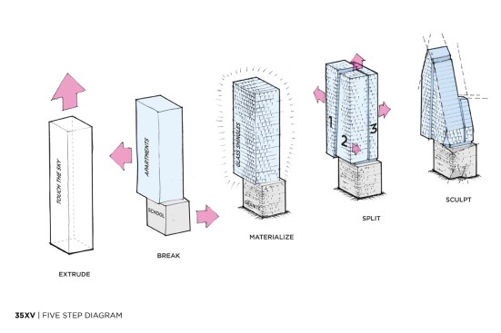 In New York City, where space is at a premium, developers have to seize opportunities where they can find them—even in the air. Designed by FXFowle, 35XV was made possible when Alchemy Properties acquired air rights over Xavier High School. The building’s six-story granite-clad base is an expansion of the school, and from it rises a 19-story glass-clad icicle that holds 55 one- to four-bedroom apartments, as well as amenities such as a gym, playroom, and shared terrace. The tower’s form derives from setbacks and sky exposure planes: It cantilevers 17 feet over the existing school and 36 feet over the rear yard, thanks to a structural system that supports it from the back of its base.