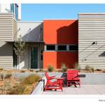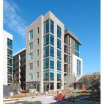 Building materials are elegant and include glass window wall, ceramic panel, brick, precast concrete, horizontal bevel siding and exterior cement plaster. These tactile materials reflect those found in the adjacent neighborhoods.