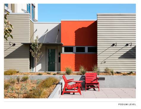 Tracking LEED Gold, 38 Dolores incorporates single loaded open-air circulation providing fully passive ventilation and enhanced day-lighting. This highly sustainable solution enables all units above the podium to receive natural light and ventilation and eliminates the need for residential air conditioning. Other sustainable strategies include a 5,000 sf green roof (over 40% of the roof area) to both control and filter rainwater. On-site one-to-one bicycle parking and repair developed in collaboration with the San Francisco Bicycle Coalition as well as City CarShare ensure easy and sustainable transportation alternatives for residents.