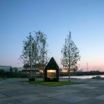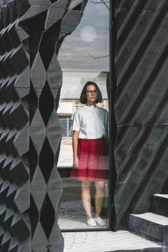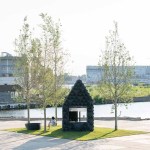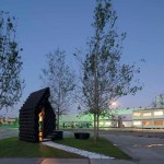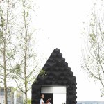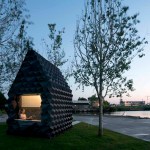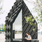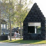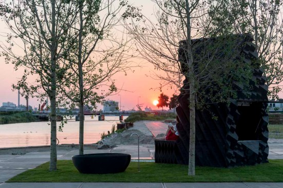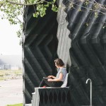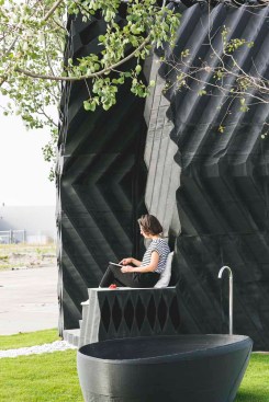 The design plays with the relations between indoor and outdoor spaces creating luxury within a minimum footprint. Entirely 3D printed with black colored bio-based material, it showcases different types of façade ornament, form-optimization techniques and smart solutions for insulation and material consumption. The floor and stepped porch are combined with a concrete finish creating a beautiful pattern that extends into a path in the pocket park. In the green around the cabin you can enjoy the sculptural printed bathtub, and watch the sunset surrounded by waving poplar trees.