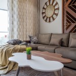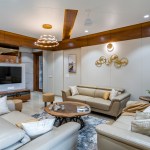 The drawing room is characterized by bespoke furniture in hushed tones. Neutral sofas, patterned rug, and ornate puffies embellished with raw-wood center table are highlighted with brick-patterned wall cladding.