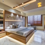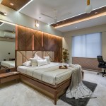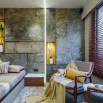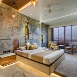 Rich veins in the marble wall cladding with the grid of SS Patti creates a dramatic backdrop to the master bedroom. Also, the vertical niches creatively break the solidity of the wall and the elevated platform with plush flooring gives an astonishing charm to the room. The bathroom door is beautifully flushed within the backdrop and this whole design approach of the architect met the client’s satisfaction to the next level.
