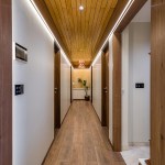 The passage leading to the bedrooms highlighted with wooden flooring and wooden ceiling draws the eyes upwards while the profile light illuminates the space.