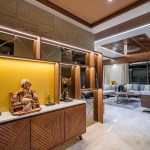 The main attraction here is the theatre room which acts as an extension to the living room through visually separated through a sound-proof sliding glass door. Getting opened, it gives a perfect corner for family sitting stretched out from living. The highlight of the room is the acoustic wall which is clad to make it look interesting. Texture creates drama in the room with an essence of a cosy ambience. The plush material of the sofa furniture adds luxury and comfort to space.