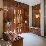 One is greeted by a geometric-decorative panelling that enlivens the vestibule and shields the overall view of the house. A mirrored grid wall with wooden panelling acts as a backdrop to the console unit.