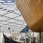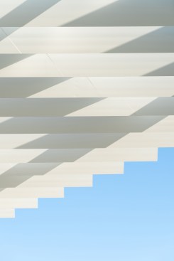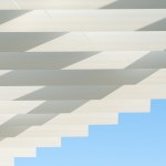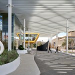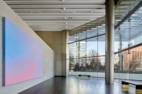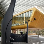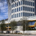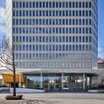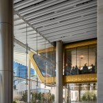 One of the most striking features of the renovation is a 10,000 FT louvered canopy that appears to glide through the building, providing shade for the large, outdoor plaza and visual connection between outside and inside. A near seamless glass façade replaces formerly opaque walls, blurring the division of public and private spaces and providing visual access to the exhibit of custom artwork throughout the lobby.
