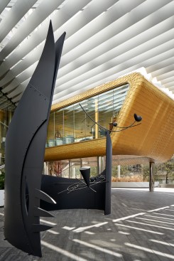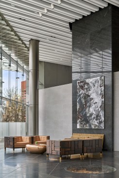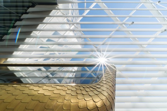As a further invitation to visitors, a dramatic glass spiral staircase, visible from outside, commands attention and draws guests up into the sculptural restaurant suspended above the lobby. The dramatically designed restaurant is presented as a golden floating sculptural element and embodies dining as performance, continuing the building’s engagement with the public realm. The exterior is clad in weathered metal facets that make the restaurant an alluring piece of public sculpture.