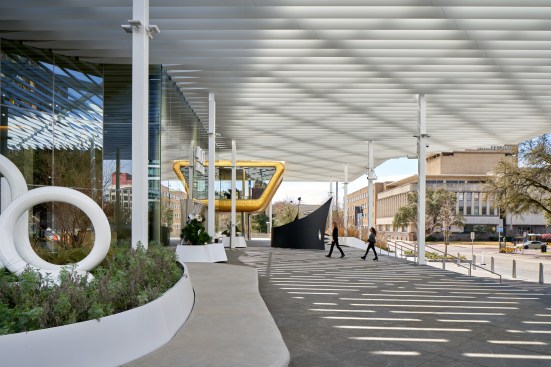 The former plaza was unshaded and unwelcoming. To dissolve the harsh edge and animate the space, the original barriers were eliminated or softened with organic forms. The landscaping works with the canopy to provide shade and comfort from the elements and offers welcome natural relief in the highly urban context. The former rooftop solarium was a severe and vacant space entirely too hot for occupation, but the new design transforms the space into an open outdoor terrace with spectacular views of the Dallas skyline.