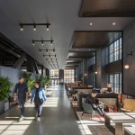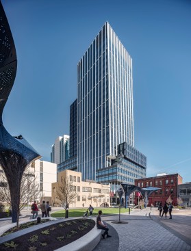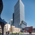 The massing relates to the context of the neighboring areas – which to the north are dense and commercial and to the south are small, industrial, and residential – while a collage of complementary vertical and horizontal textures on the façade creates a dynamic expression.