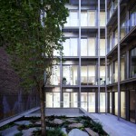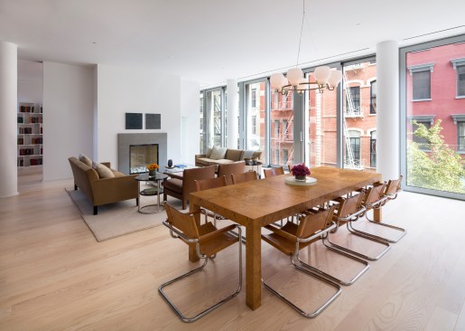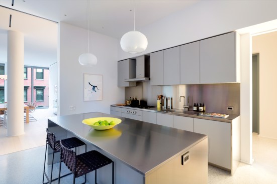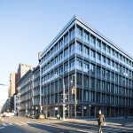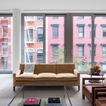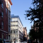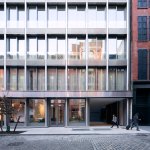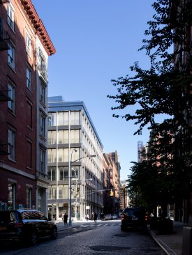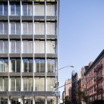 This 50,000 sf condominium is located in Manhattan’s SoHo district, a landmarked neighborhood noted for its cast iron architecture from the late 19th century. The six-story building is deferential to the pedestrian scale of the neighborhood with a massing that matches the height of adjacent structures. The design offers a contemporary interpretation of the neighborhood’s cast iron architecture; articulating traditional characteristics such as uniform composition, column and spandrel vocabulary, and prefabricated construction in a highly modern tone. Exterior materials including stainless steel, brushed aluminum, metal mesh, and exterior shades are layered to create the depth and texture that exemplifies cast iron façades. Inside, the building houses five, two bedroom units; four, three-bedroom units; and a penthouse. Retail space is located on the ground level, along with the residential lobby and an entrance to private underground parking. The lobby includes two 56 sf terrarium gardens located on either side of the entrance and visible to the public from the street. The terrariums are filled with a mix of long-leafed flowering plants and sculptures by artist Paula Hayes. The right side garden features a gazing globe pedestal while the left side garden features a hanging trapeze chandelier sculpture. The interior panels and frames of the window displays match the building powder coated aluminum façade.
