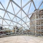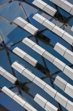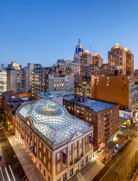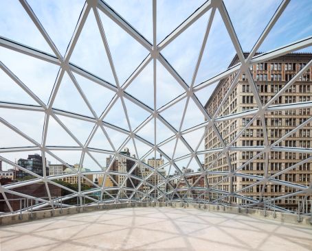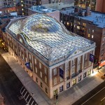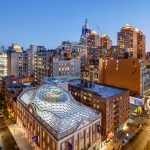 The restoration and expansion of the building includes sensitively preserving two façades, new bronze storefronts in the likeness of the original 1928 design, and a 3-story rooftop addition, composed of a self-supporting free form shell grid dome atop a reconstructed hipped roof of steel-and-glass with dappled gray terra cotta sunshades. Solar insulation, light infiltration, glare probability studies as well as investigation of glass dome precedents informed the glass mapping over the dome structure and the development of sunshades and other glass shading solutions.