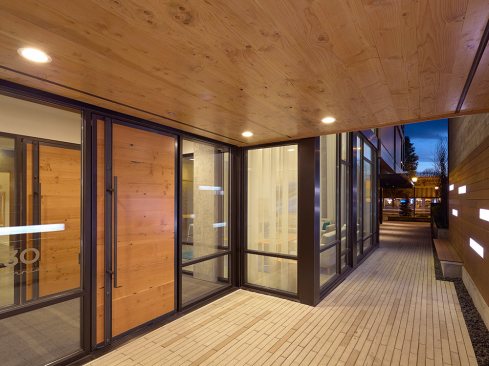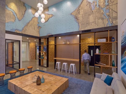 The nearly 5,000 sf of retail wraps around the north corner of the building and extends into a new mid-block pedestrian connector. This pass through is generously widened and activated by holding the building back at ground level and lining it with retail, the building’s main entry and activity spaces such the tenant amenity and lounge area. This activity follows the entire connector and continues part way along the back of the building with the fitness center, creating eyes on the alley and enhancing safety. The landscaping along here works with the modulation of the building to create a ground plan to successfully integrate both and bring an enhanced amenity to the neighborhood.