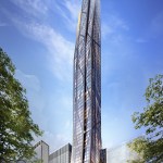 The façades of the tower are a structural glazing in standard glass dimensions and the bracing structure follows the simplest and most economical geometry. Living inside this building feels like inhabiting a powerfully present and reassuring structure, similar to that of a large tree. The tower draws its shape from the desire for more daylight in the streets. The narrow triangular top section is putting its unusually thin silhouette to good purposes. This tower is a monument to the rules of shadow and light, and to the forces of the wind.