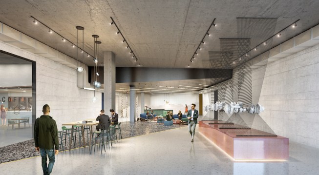 Inside, visitors are treated to a space that draws a connection between the site’s beginnings as a zipper factory to its function today as a highly active mixed-use space in the heart of a thriving arts scene. Preserving found objects within the old factory space and displaying them in the new lobby was part of a series of design gestures that celebrates the site’s rich history; sewing machine pieces are hung from colorful sewing “strings” at the front glass, and a feature wall finish is made of repurposed shirts by Eileen Fisher.
