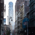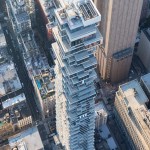 The top of any tower is its most visible element and, in keeping with this, the top of 56 Leonard Street is the most expressive part of the project and relates to the tradition of iconic tower tops in New York City. This expressiveness is driven directly by the requirements of the interior, consisting of ten large-scale penthouses with expansive outdoor spaces and spacious living areas. These large program components register on the exterior as large-scale blocks, cantilevering and shifting according to internal configurations and the desire to capture specific views that ultimately result in the sculptural expression of the top. Meanwhile, the base of the tower responds to the special character of Tribeca. This is a part of New York characterized by a wide range of building scales – from small townhouses to large industrial blocks and the ubiquitous high-rise buildings of downtown. By grouping together blocks of various sizes, including lobby, parking deck, housing amenities and a few apartments, the tower reflects and incorporates each of these neighborhood scales.