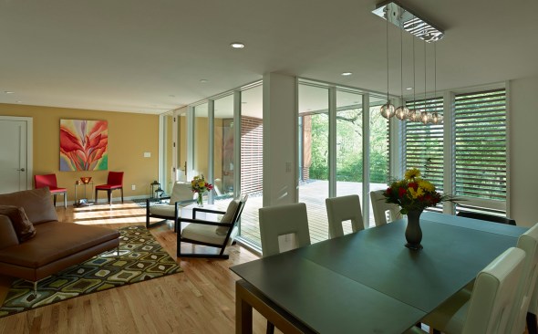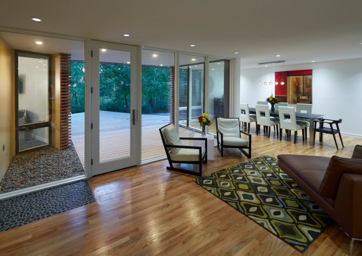 The existing house faced the typological problems of small, segregated spaces with traditional windows. By opening the living areas and integrating layers of transparency into the design, the spatial boundaries of the home are purposely blurred, and at times, completely obliterated. The simple rectilinear plan of the existing home is now modified by a striking angular expansion, used to preserve and respect a large oak tree in the front yard and also purposefully control the views to adjacent lots when approaching the home from the drive. This formal shift not only creates the cradle-like entry space for visitors but also allows the resident to experience the interior and exterior of the home simultaneously through planes of glass and cedar. Floor to ceiling windows flood the interior with natural light and visually extend the primary living areas out onto the front porch. From a position near the front door, a connection is made to the central oak through the sitting area of the master bedroom, further blurring the boundaries of public and private space in the home.
