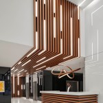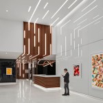 The security desk was pulled more prominently into the space, crowned with a custom light fixture designed by artist John Procario with Todd Merrill Studio. Walls showcase a curated, changing art gallery, featuring local and emerging artists, to create interest for tenants by provoking thought and conversation.