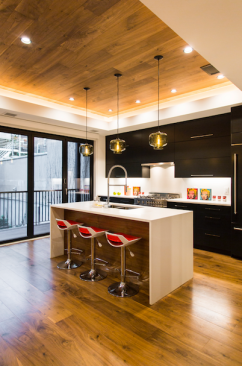 A focal point in the kitchen is the tray ceiling, whose recessed interior is also clad in walnut to match the flooring and the paneling on the seating side of the island. The partitions of a glass NanaWall at the end of the kitchen fold to the side, opening the space to a 6½-foot-deep balcony that runs 19½ feet long—almost the entire width of the house—and bringing in natural light.