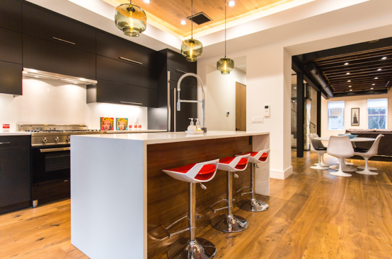 Using a stark black and white palette leavened by lashings of walnut and natural light, Dixon created a sleek, modern design for this kitchen in the renovation of a four-story Hoboken, N.J., townhouse.