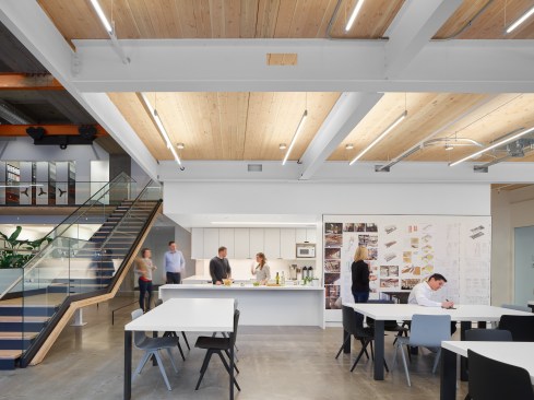 The studio is filled with a range of spaces to encourage gathering, spontaneous conversations, curiosity and knowledge. An open materials library in the mezzanine is easily viewable and accessible to all. A central kitchen area, the heart of our studio, fosters camaraderie and doubles as a meeting space. Open project pods, where teams display current work, are active meeting and learning areas inspiring ideas and dialogue. Finally, a dedicated maker space encourages design exploration and creativity.