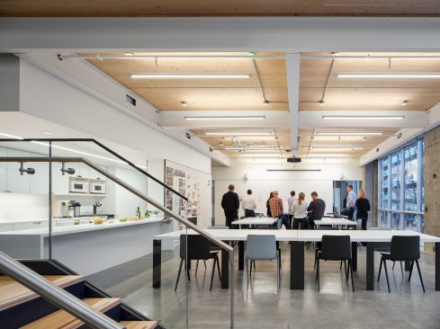 Based on the belief that “buildings are habitats for people,” our spaces intentionally connect to nature. Lush trees outside the 24-foot-high windows complement ample foliage throughout the interiors; large-scale ceiling fans mimic natural breezes for thermal and airflow variability; and the row of east-facing windows provides dynamic and diffuse light that shifts throughout the day. In materials, raw, naturally textured concrete merges with cross-laminated timber (CLT) at the mezzanine, pods, kitchen and entry.