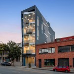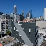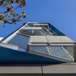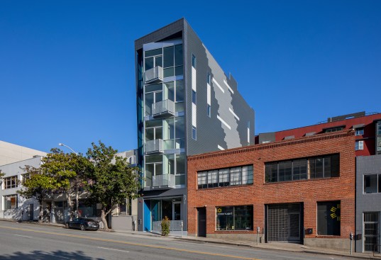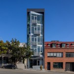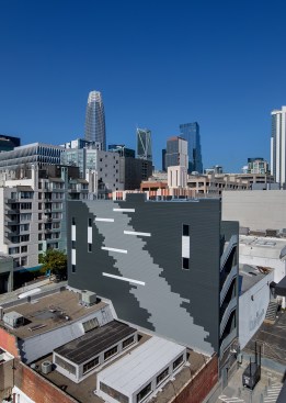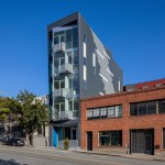The Harrison Street facing façade can be admired amongst the traffic jam that typically awaits the onramp to the San Francisco-Oakland Bay Bridge. The front-most portion of the building cantilevers over the sidewalk with an obtuse angle. This angle creates a visual tension with the surrounding a five-story metal-framed element that cants out from the face of the building. Custom metal panels lap the framed element with two tones, gray at the face and exterior sides with a pop of blue color wrapping the interior. The ground floor recessed entry carries the blue metal panels into the entry sequence.
