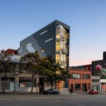 A rhythm is created on the street-facing elevation with offset floating perforated metal balconies and a pattern of obscured glass in the storefront system. Like many buildings in San Francisco, the site is built out to its property lines. Along both lengths of the building, the blind walls were designed with a pattern of pre-painted Hardie Fiber Cement Lap Siding. The rear of the building conceals an open-air stairway clad with industrial metal guardrails.