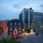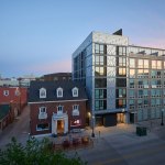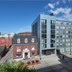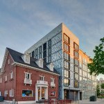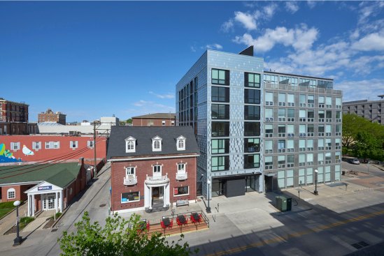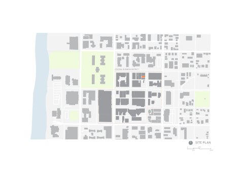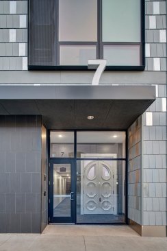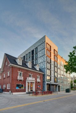 The 41’x95’, 7-floor-tall building occupies a constrained downtown site left by the burning of a much-loved historic house. The original, salvaged front doors memorialize the main entry.