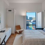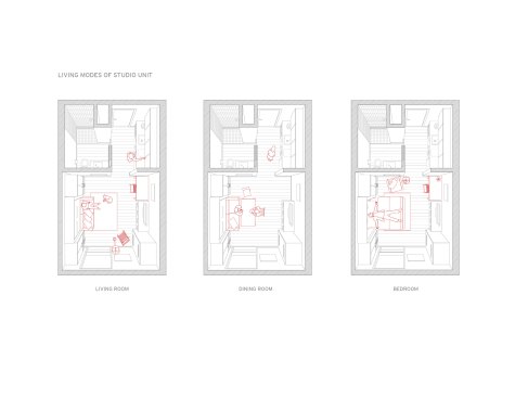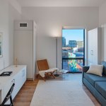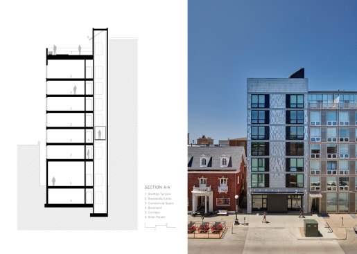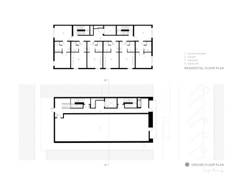 Above ground floor retail, 36 micro-units cater to young professionals and graduate students. One-bedroom units (474-sf) bookend each level’s single-loaded corridor. Between them, studio units (284-sf) maximize usable space with a compact kitchen and bathroom, built-in storage, and transformable furniture. Floor-to-ceiling windows lend grandness to petite quarters.