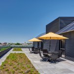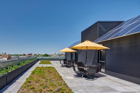 A photovoltaic array powers resident amenities, which include a rooftop gathering space with gardening beds, a first-floor lobby with coffee bar, and basement storage units.