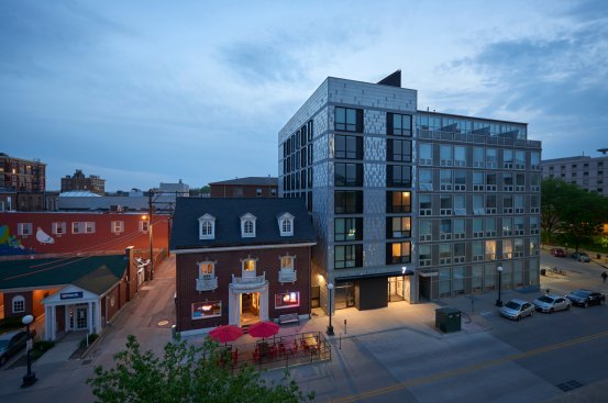 The black entry surround and window shrouds punctuate an otherwise gradient pattern of mill-finish and pre-weathered zinc panels. The mosaic shifts over the course of the day, as incident sunlight coaxes varying degrees of specularity in the material. The panels’ natural sheen will weather over time, evolving alongside the ever-changing Iowa City downtown.