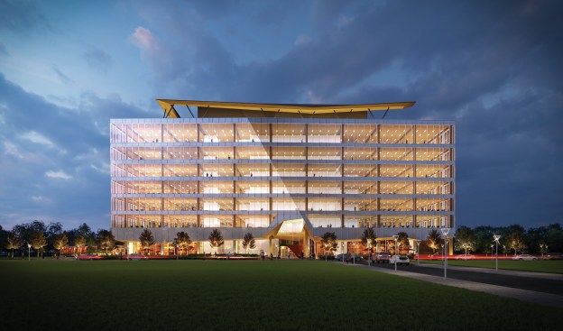 To reflect the elongated rectangular form of the site, the massing spans 80 metres along Wade Avenue and only 24 metres deep into the site. Instead of a condensed core typical of most office floorplates, the services are extended along a linear strip with a central throughway to connect the west and east sides of the core, intended to maximize natural light penetration for the occupants.