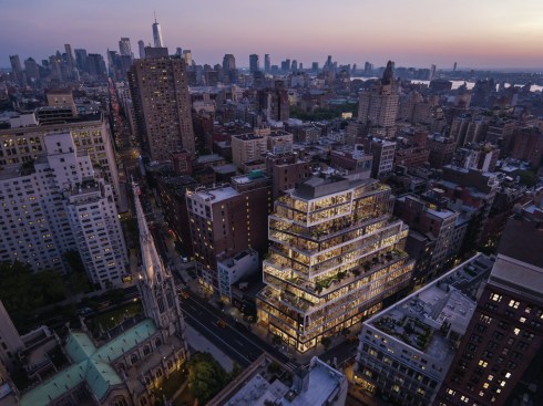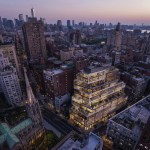 A simple palette of white metal panels, clear glass windows and wood soffits echoes the classic iron-cast building across 11th Street, while picking up on the white limestone of the iconic Grace Church across Broadway. These materials are woven together to unify the glass volumes, and help the offering to create an integrated vertical expression. Landscaping on the balconies softens the exterior while reinforcing the connection to nature and the church courtyard.