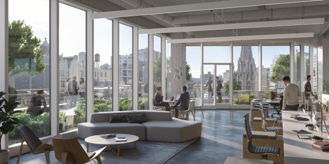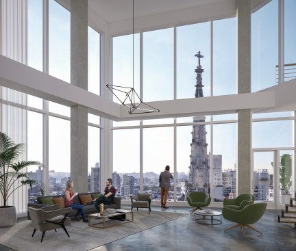 799 Broadway interiors will feature exposed cast-in-place concrete structure and ceilings, offering an innovative re-invention of the traditional New York City lofts modernized with efficient mechanical systems and open spaces. Located off of Broadway, the main lobby offers clear sight-lines to a shared courtyard that will serve as a focus for social and business functions. The courtyard doubles as the outdoor component of a tenant lounge on the lower level, where many of the building’s amenities are housed, including a gym with a locker room, showers, and ample bike storage. Retail frontage along Broadway further integrates the building into its vibrant surroundings, while on the rooftop, a terrace boasts views of the East River, TriBeCa, One World Trade and the Hudson River.