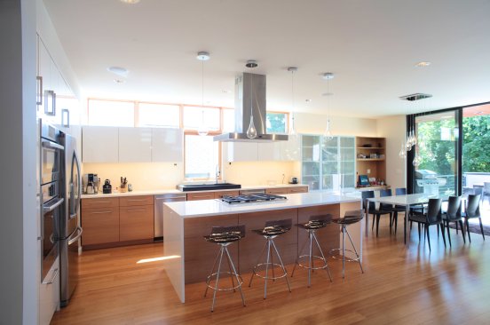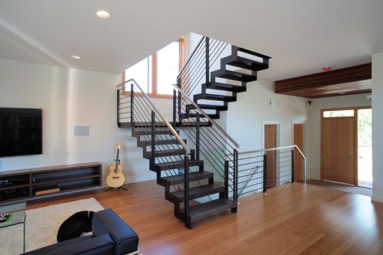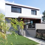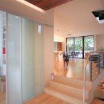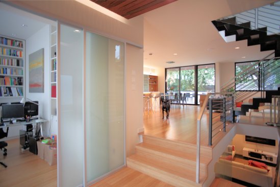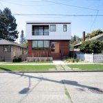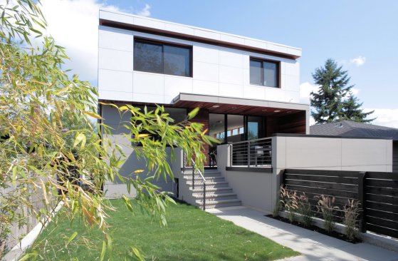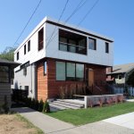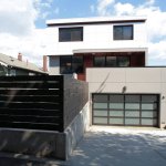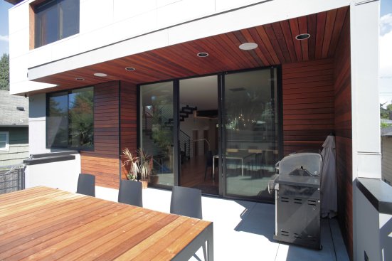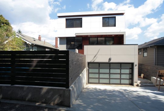 A compact 2 car garage (sharing space with the also compact backyard) dubs as a deck at the main level. The front portion of the main floor is dropped closer to the street level to enhabce connection and curb appeal.