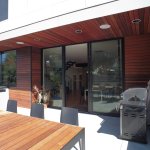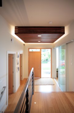 An oversized bioretention cell processing the roof and deck water, and photovoltaic panels on the roof contribute to reducing the carbon footprint of this generous sized small house. Finished in August 2015.