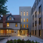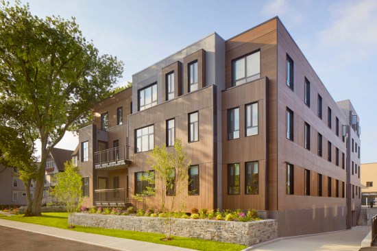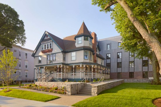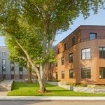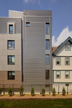 83 Gardner Street is a four-story, 38-unit apartment building in Allston. The project is the first phase of Packard Crossing, a residential development owned by The Hamilton Company that provides moderately-priced housing for the community, creates new connections in green spaces, and unifies the surrounding neighborhood. 83 Gardner includes the preservation and restoration of one of the last remaining Victorian-era houses on Gardner Street. The restored porch and ground floor lobby/lounge serves as a threshold to connect the historic structure to new construction, building upon the existing massing and rhythm of its residential street. Working in collaboration with Ground, Inc., the project preserves existing trees in a newly designed courtyard. 83 Gardner Street is on track to be LEED Gold Certified. Drone view provided by Odeh Engineers.