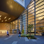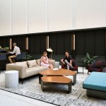 Other finishes within the design include a pattern of brass inlays in the Terrazzo flooring that is carried from the lobby into the pavers outside. A combination of vertical and custom fabricated horizontal concrete panels replaced the lobby’s former monolithic dark granite. Dark-stained wood paneling and pops of color in the furnishings draw attention to the lounge and meeting areas and provide contrast to the overall neutral palette.