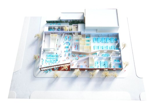 "Rather than simply dividing the existing warehouse into various zones for different activites, or, on the other hand, creating a continuous and undifferentiated space," says Bunge, "We chose to create variable connections between gastro, event, design, exhibition and retail spaces. Neither rooms nor an open hall, the spaces kind of bleed into each other, allowing people who are curious to see what would normally be going on behind closed doors."