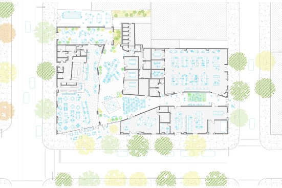 The architects' principle of remix extends to the physical transformation of the formerly opaque one-story building. "Some aspects of the existing building have been maintained," Bunge continues. "While others have been rebuilt in ways that make it sometimes initially unclear which part is new and which part is old. In other places we have sought to create tension or contrast between existing and new conditions or between differerent materials."