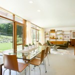 The living area features floor to ceiling windows. Regardless of the season, the homeowners can sit inside and still enjoy the outdoors.