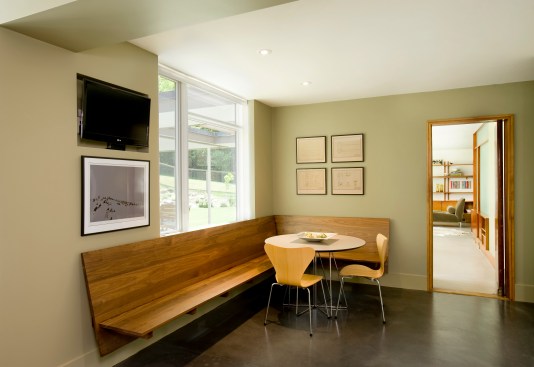 The newly renovated kitchen addition honors the original architecture but updates the home with a larger kitchen area. The space includes a casual dining area with a wall-mounted banquette, and an expanded laundry and mudroom space. The addition allows for improved access and views to the yard from the kitchen. The homeowners enjoy the indoor/outdoor feel that this room offers. The custom built-ins are the perfect spot for the mid-century ceramics and glassware the homeowner had been collecting for several years before purchasing the home.