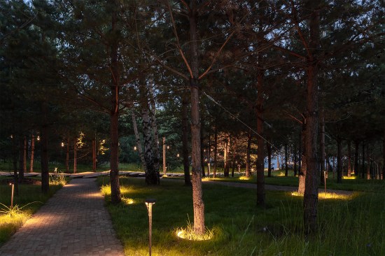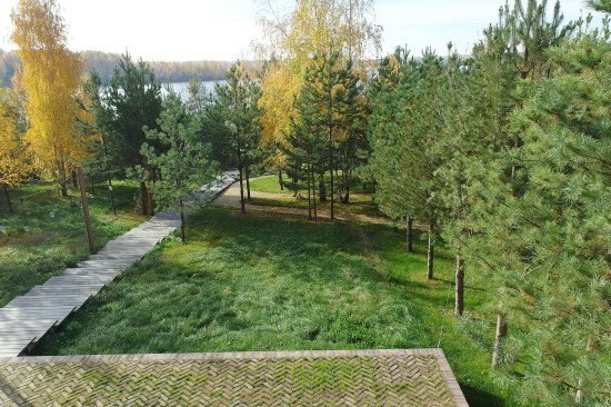 The site is located in a woodland area, to the north of Moscow. The project suggests to clear the lower part of the land to create framed views on the lake and includes a long alleyway of pine trees transplanted from the site, as well as a flowering meadow and a small orchard of apple and cherry trees.